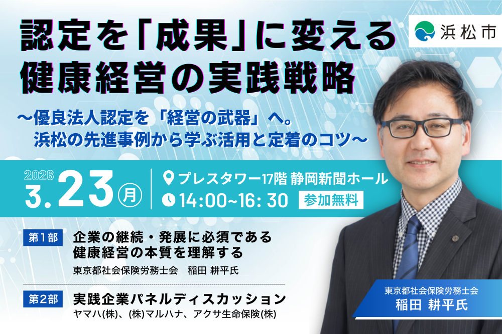 専門家・稲田耕平氏による本質を突いた戦略解説と、浜松を代表する実践企業及びサポート企業による討論から、認定を経営成果に繋げる具体策を学びます。